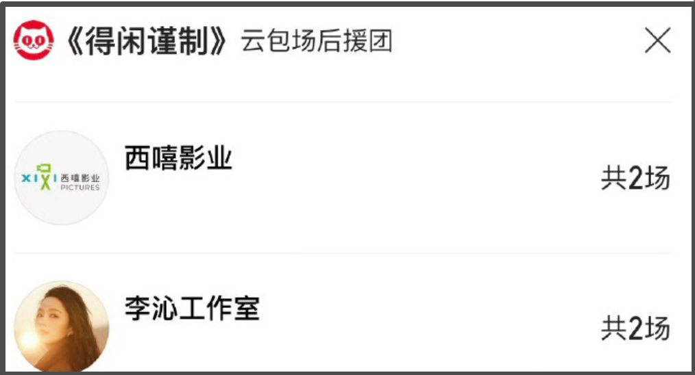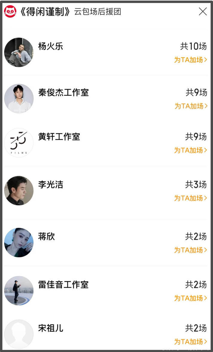 除此之外,杨烁、黄轩、杨洋、刘敏涛、白宇帆和章若楠等和正午阳光合作过的演员们也都包场为《得闲谨制》助力。据不完全统计,为《得闲谨制》包场的明星已经多达30余位,大多数人都是包了一场,包场数量最多的是杨烁和白宇帆,他们都是包了10场。