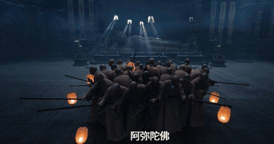 比如剧中的第二案“成佛寺的哭声”,在幽暗的寺庙中,众僧人手提灯笼围成一圈,大殿中央卧着一具巨佛塑像,阴郁的氛围,配上呜咽的哭声,中式恐怖拉满。