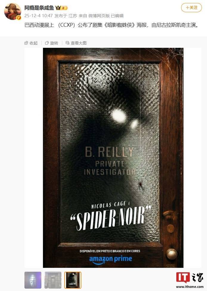 IT之家 12 月 4 日消息,据博主 @阿瘾是条咸鱼 今日分享,在巴西动漫展(CCXP25)上,漫威超英真人剧集《暗影蜘蛛侠》首张海报公开,本片将由尼古拉斯・凯奇主演。