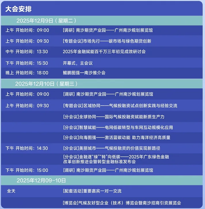 此外,大会还设置重要嘉宾一对一交流、气候友好型企业(技术)博览会暨南沙招商引资展览会、南沙期货产业园实地调研等配套活动,为参会者搭建精准合作桥梁,全方位展示南沙发展现状与营商环境。